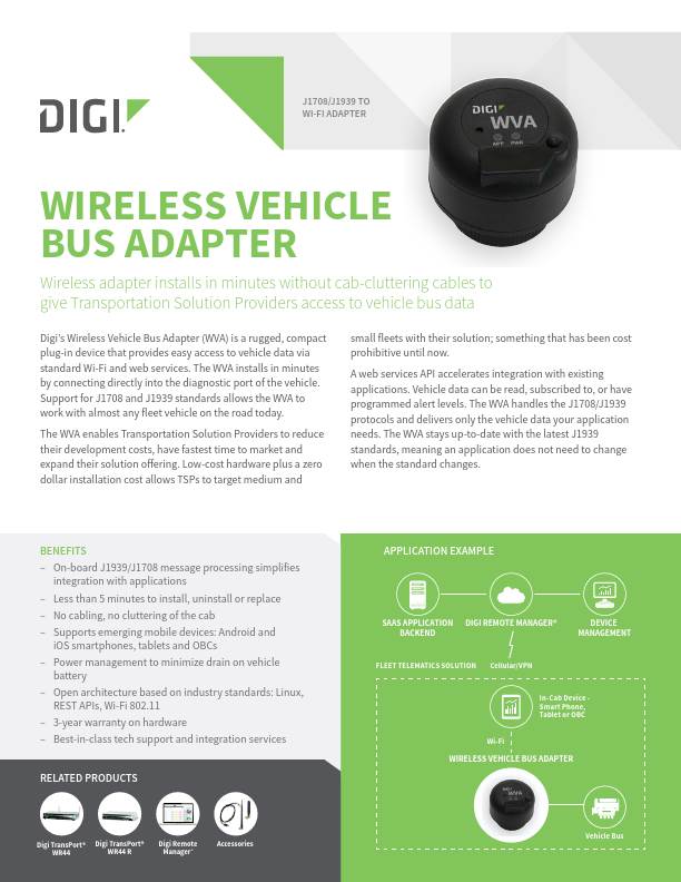Wireless Vehicle Bus Adapter Wva Datasheet Digi International